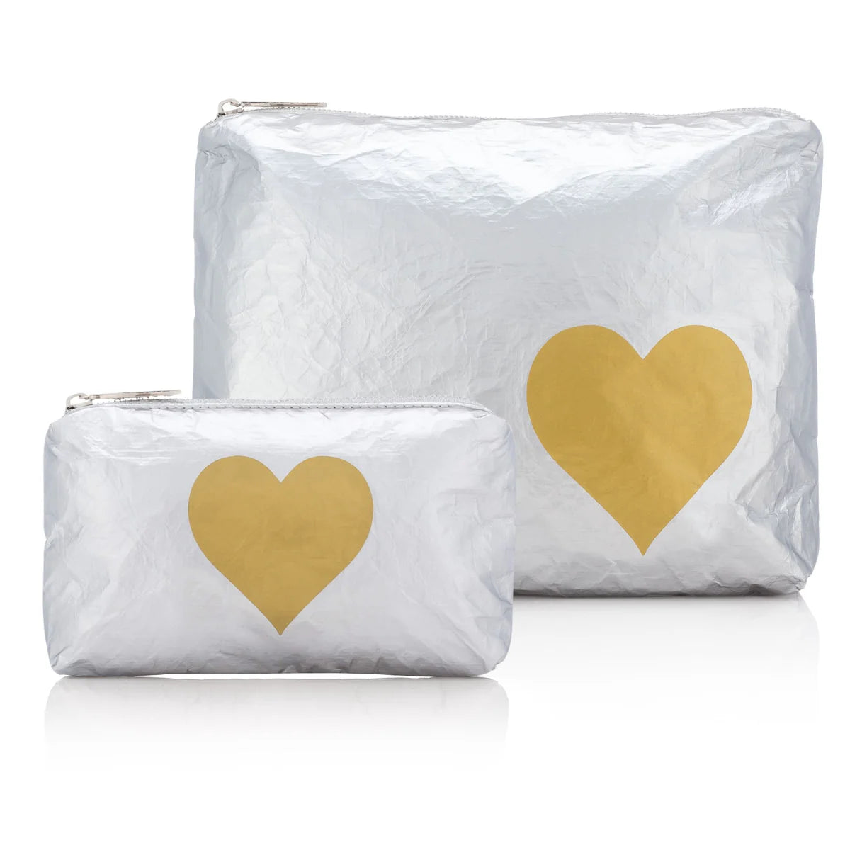 Matching set of two. One medium pouch and one mini pouch. The medium pouch can be used as a chic fold-over clutch for day or night or turn it into a large wristlet with our clip on wrist straps. The mini can also be used as a clutch or wristlet. Protect your items from unwanted moisture and spills, made from a unique material that is super soft and splash proof. Medium pouch measures 11”x9”, mini pouch is 8.5”x5”. Wrist straps sold separately.