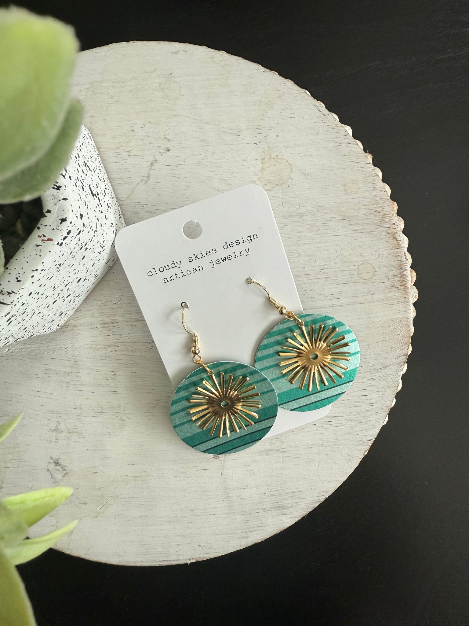 Bring the glitz and glam of a starry night indoors with the STELLA wallpaper earrings.  A breathtaking starburst of gold accent the 1.5" round wallpaper.  Delight in the artistry of the design every time you wear them.