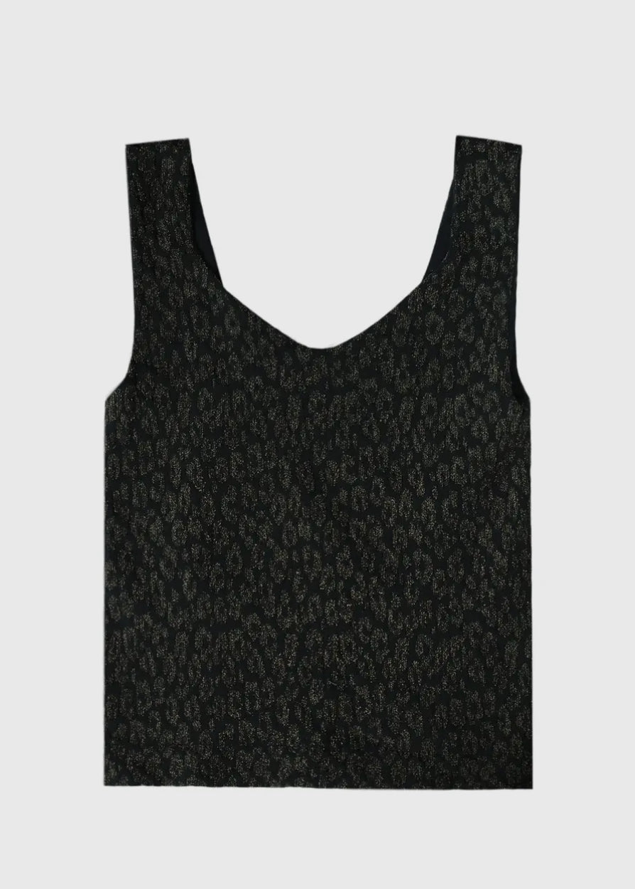 This seamless v-neck tank is lined and woven with golden lurex for a sleek fit. Black, brown, and chili oil leopard print.